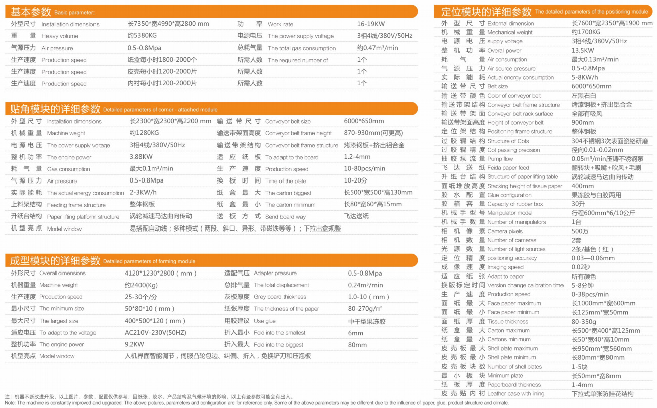 该机主要分为定位模块、贴角模块和成型模块三大部分,可实现各类纸盒、木盒、胶盒生产时的自动送纸、自动过胶、自动贴角、自动定位、自动成型和自动压泡等,系列工艺工序的自动完成,转版速度快,制作盒体精美。定位模块的黑白皮带、双镜头、自动纠偏、皮壳板贴衬定位、五片板定位。贴角模块的不粘胶胶带槽、双升纸台。成型模块的智能调节、自动锁固、伺服凸轮动作、免换铲刀和压泡板等,均由我司自行研发设计生产,并获得多项国家专利。